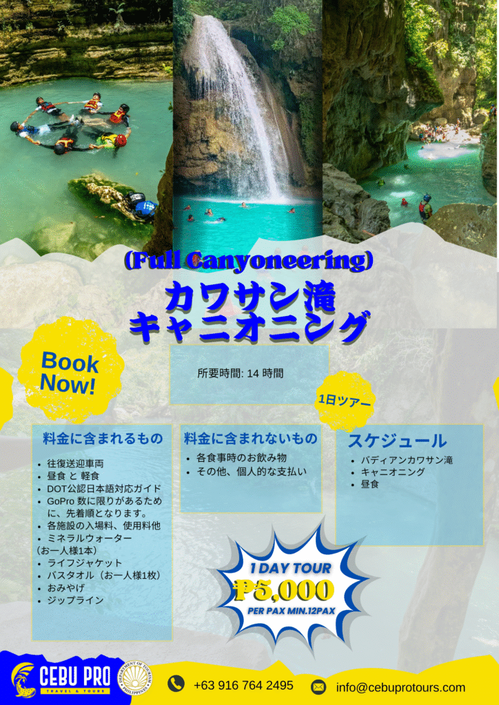 心も身体も癒される、冒険と絶景の融合体験。カワサン滝は、セブ島旅行で絶対に外せないスポットです。青く澄んだ水、轟音とともに流れ落ちる滝、そして自然に包まれるマイナスイオンたっぷり浴びられる感覚を、ぜひあなたも体験してみてください。