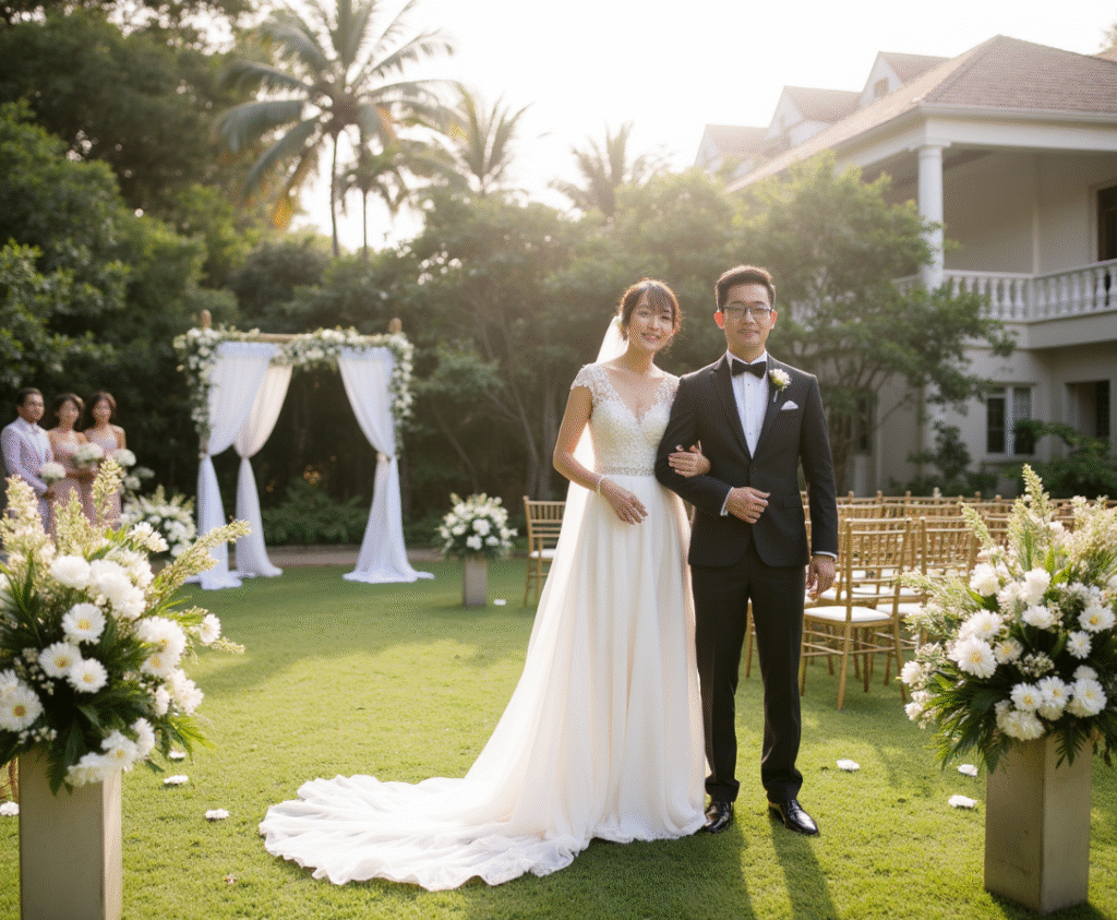 セブ島の富豪が所有するプライベート邸宅の庭園を利用した、ラグジュアリーな結婚式。