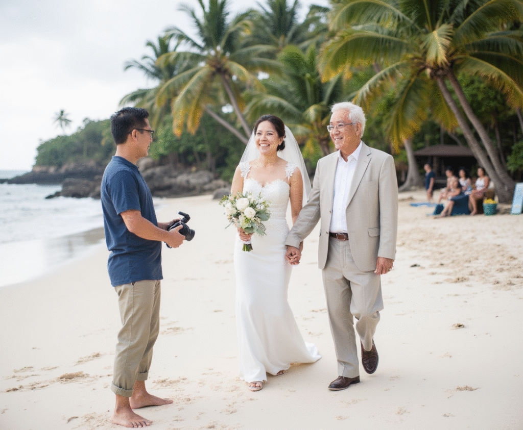波の音をBGMに、白い砂浜と青い海を背景に誓いを交わすセブ島定番の挙式スタイル。